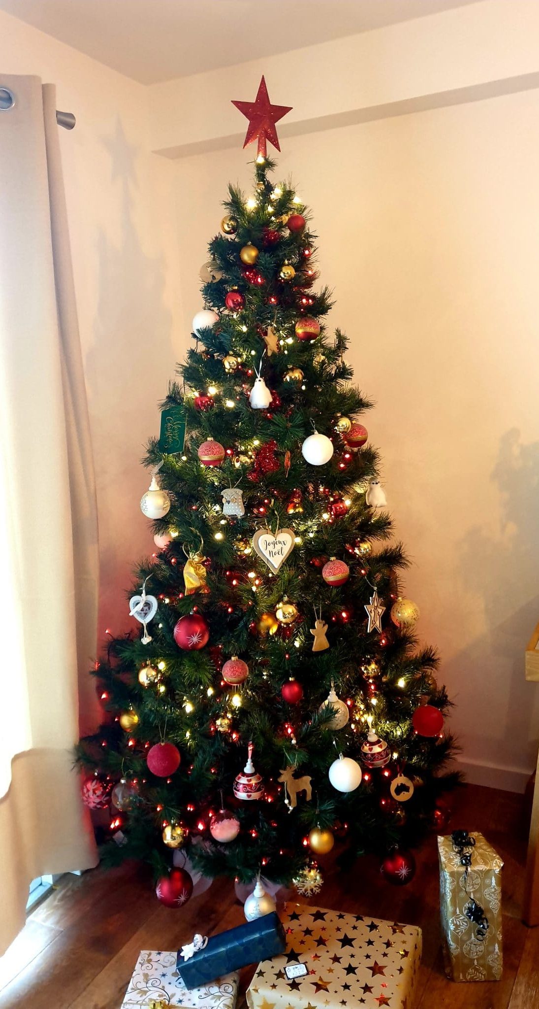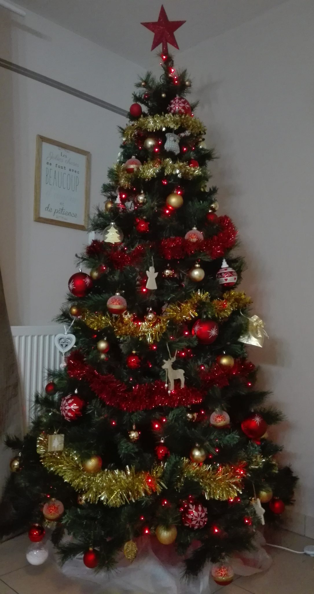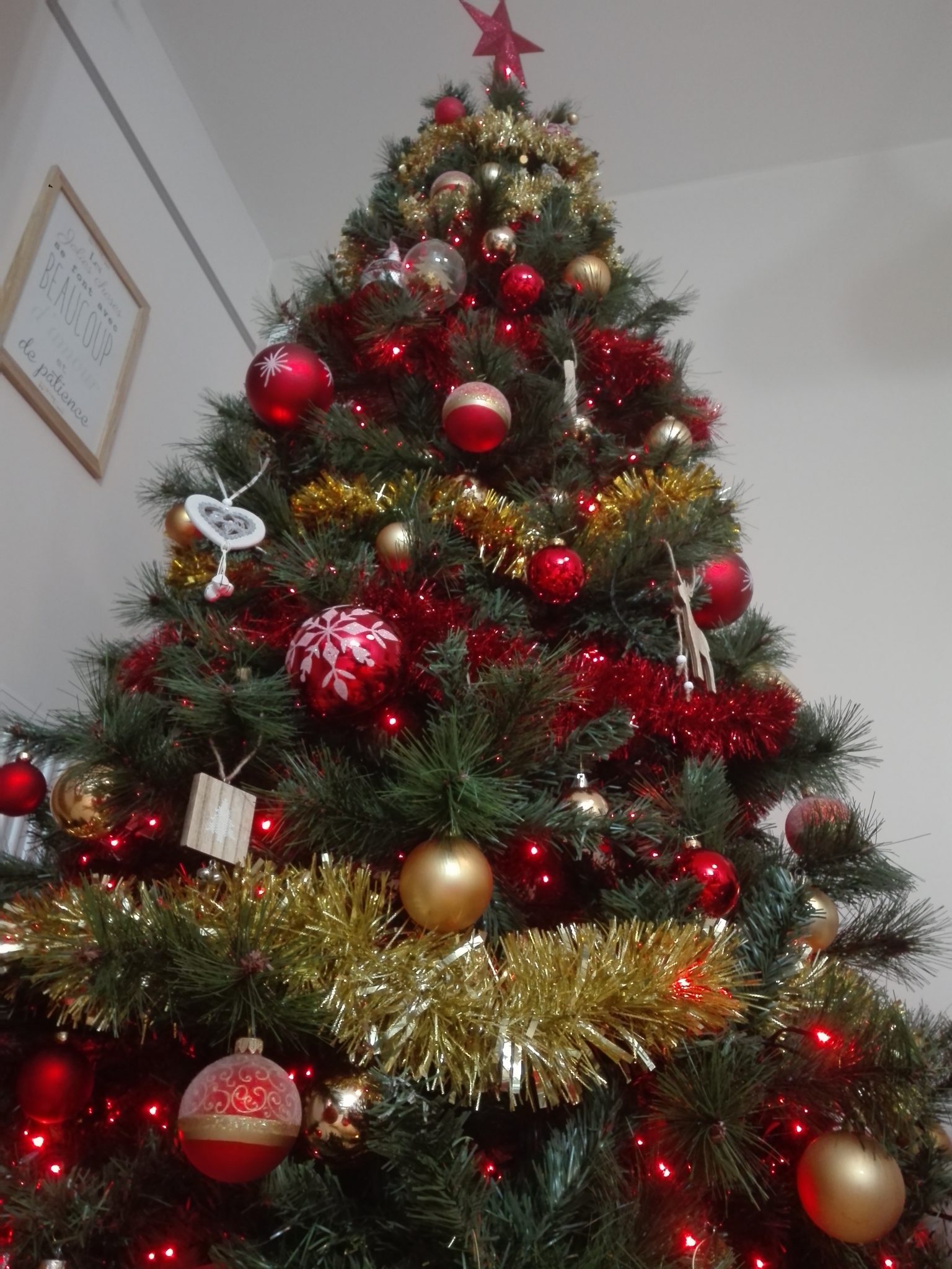 J’ai choisi un sapin artificiel, imitation pin et épicéa de… 2,10m. Sur le coup, c’est un achat conséquent mais quatre ans après son premier montage – démontage, il est toujours aussi beau. Il vit son septième Noël avec toujours autant de classe. (Le 1er date de 2016).