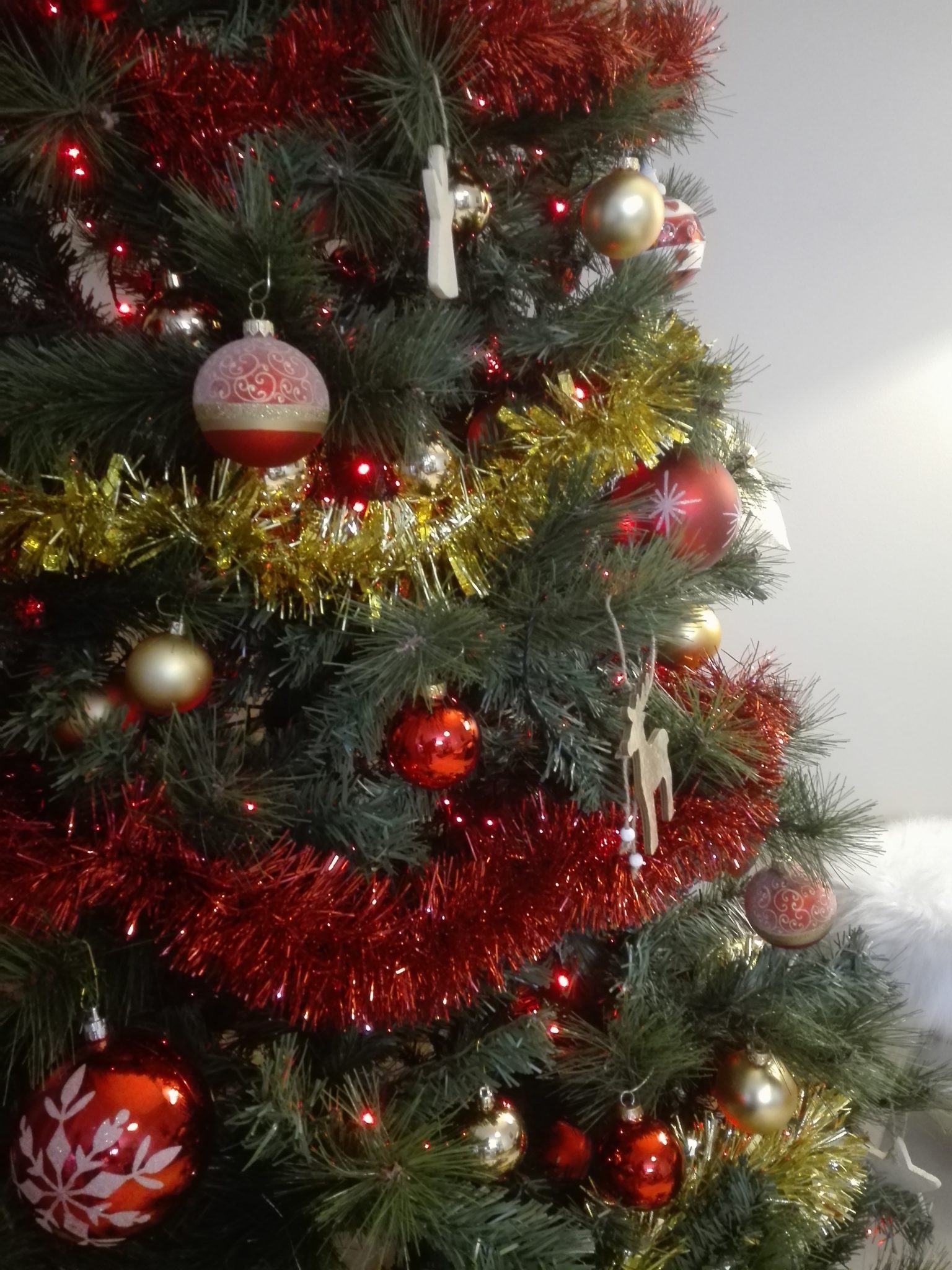 Après avoir déposé vos boules sur le sapin, vous allez pouvoir mettre en place vos guirlandes. Pour le haut du sapin le mieux c’est de prendre des guirlandes fines et puis pour le bas des guirlandes épaisses. En fait quand on y réfléchit c’est assez logique… En 2020 j’ai décidé de déposer une seule guirlande que j’ai enroulé autour du tronc. C’est discret et pourtant ça habille vraiment le tronc qui est souvent moche sur les sapins artificiels. Les photos précédentes datent de 2019, celle-ci vous montre le résultat 2022. A vous de voir quel type de déco vous préférez.